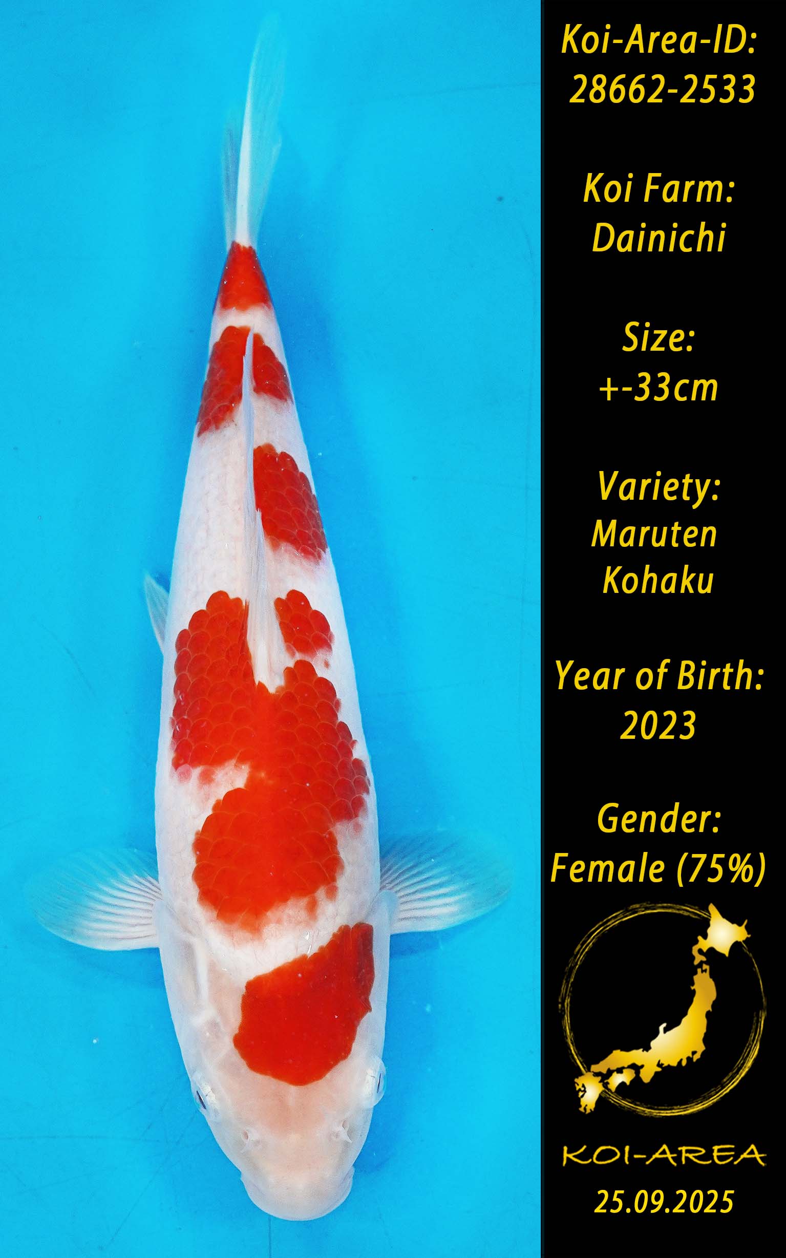 ⚠️ alle SummerSale Koi wurden Ende August bei uns im Hause fotografiert. Bitte beachten Sie, dass das Saisonende kurz bevor steht und Sie sich online einen der verfügbaren Abhol- oder Versandtermine buchen müssen. Alle Koi der Saison 24/25müssen bis zum Saisonende 30.09.2025 abgeholt worden sein. Sollten Sie online keinen passenden Termin finden müssen Sie sich innerhalb von 3 Tagen nach Rechnungsstellung mit einer Terminanfrage per E-Mail an info@koi-area.de bei uns melden. Vielen Dank