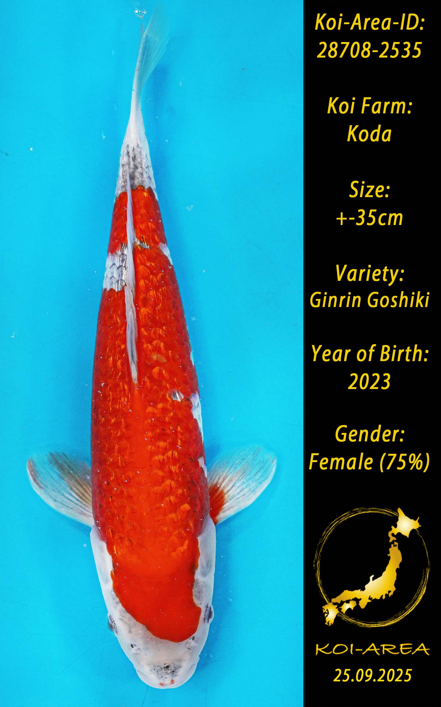 ⚠️ alle SummerSale Koi wurden Ende August bei uns im Hause fotografiert. Bitte beachten Sie, dass das Saisonende kurz bevor steht und Sie sich online einen der verfügbaren Abhol- oder Versandtermine buchen müssen. Alle Koi der Saison 24/25müssen bis zum Saisonende 30.09.2025 abgeholt worden sein. Sollten Sie online keinen passenden Termin finden müssen Sie sich innerhalb von 3 Tagen nach Rechnungsstellung mit einer Terminanfrage per E-Mail an info@koi-area.de bei uns melden. Vielen Dank
