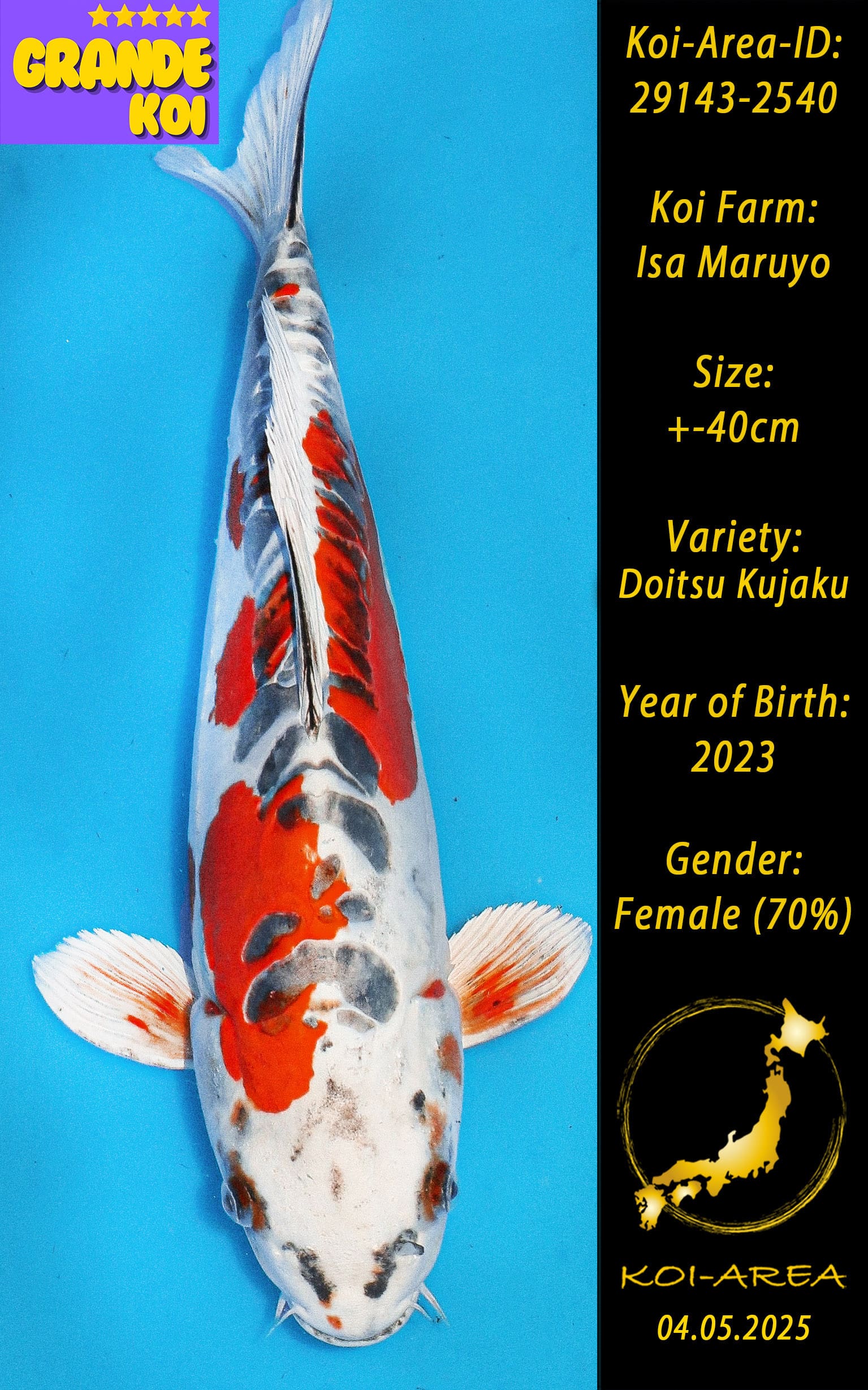 alle Koi welche ab dem 03.05.25 bei uns ersteigert oder im Onlineshop gekauft wurden müssen bis einschließlich 31.08.2025 abgeholt werden. Koi mit der ID 29xxx-25xx (2. Shipment) können ab dem 10.07.25 abgeholt werden.