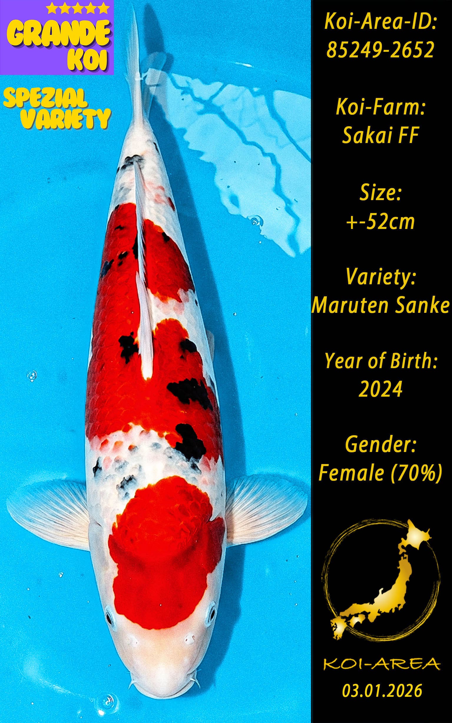 ⚠️ 🚛 🇯🇵 live aus Japan KOI – Dieser Koi schwimmt aktuell noch in Japan. Abhol-/ und Versandtermine für diesen Koi sind ab Anfang April 2026 verfügbar
